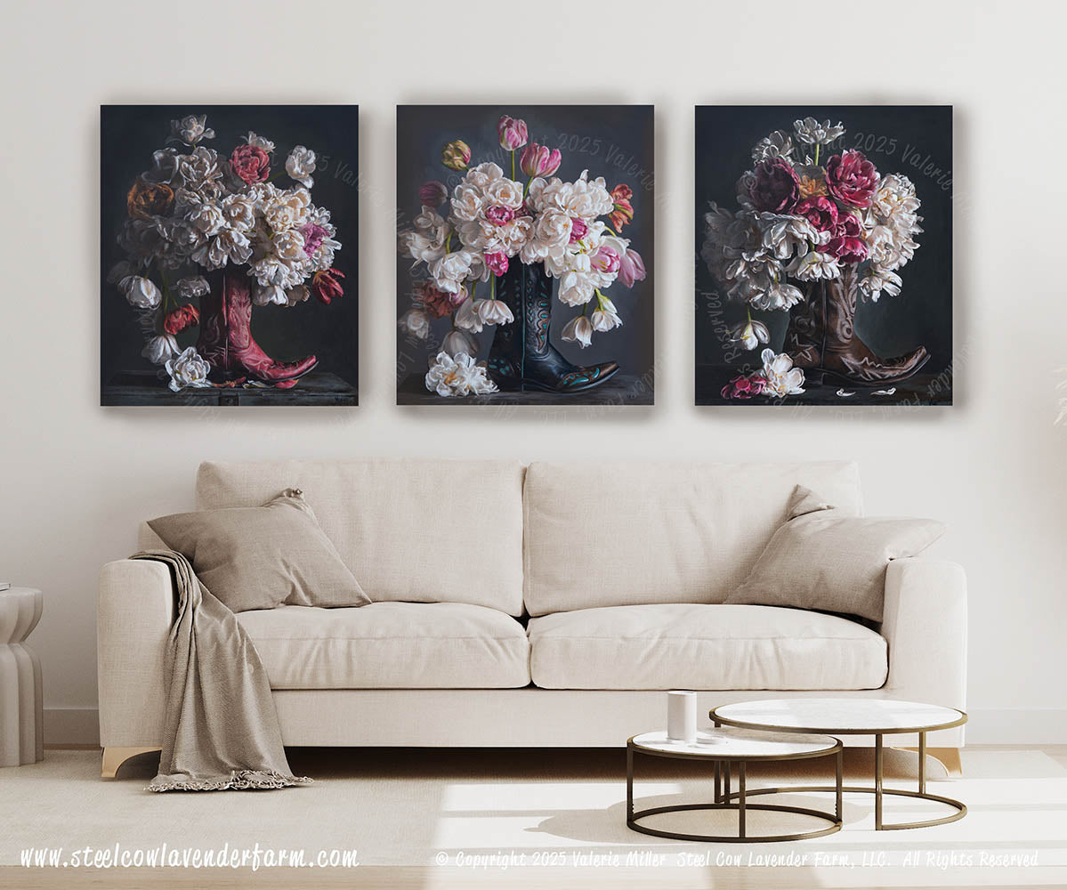 “Flowers in a Red Cowboy Boot” is based off a flower painting I created from flowers I grew in my own garden and put into a lovely Red Cowboy Boot. Originally painted with acrylics on canvas, these fine art prints are produced, made, and shipped directly from our studio in Iowa.